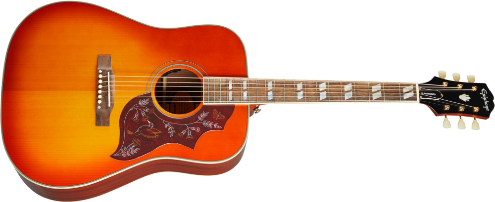 Epiphone's Most Faithful Hummingbird Takes Flight. The Hummingbird™ is one of the most instantly-recognizable and remarkable acoustic guitars ever built. The new Epiphone Inspired by Gibson™ Hummingbird blends solid woods, vintage appointments, and a Fishman® Sonicore under-saddle pickup and Sonitone preamp. Outfitted with gold Epiphone Deluxe tuners, top and back multi-ply binding, Kalamazoo style headstock, and a bone nut and saddle, it's available in Aged Antique Natural Gloss and Aged Heritage Cherry Sunburst Gloss finishes.